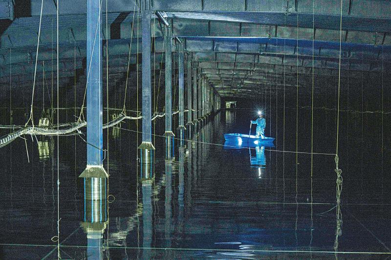 24日,陳明君和同事穿上潔凈服、戴上腳套,劃著小船進入伸手不見五指的三號水池,他們要逐一檢查維護這里的探測器單元和電子學箱。船劃到指定位置,黑暗中陳明君的頭燈光束直射水底,水下碩大的探測器單元核心設備——光電倍增管,被照得清晰可見,他和同事一起用“鉤子”把光電倍增管拉起,進行檢查。“水池里的深度是4.5米,這些純凈水的透明度比自來水高三倍以上,切倫科夫光就從里面捕獲。”陳明君告訴記者。