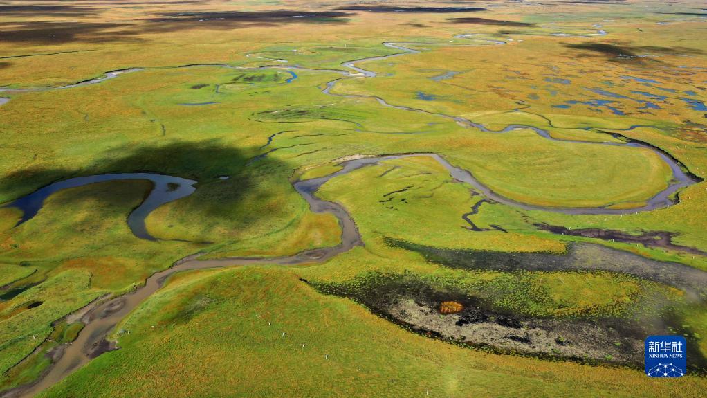 這是2022年9月21日拍攝的瑪曲縣阿萬倉濕地(無人機(jī)照片)。新華社記者 陳斌 攝