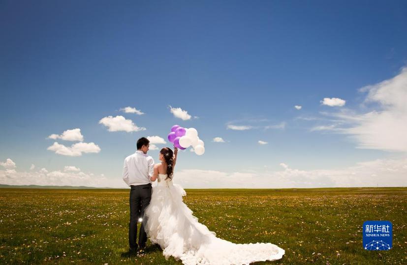 四川若爾蓋濕地國家級自然保護(hù)區(qū)鮮花盛開時(shí)節(jié),一對情侶在拍攝婚紗照(2022年6月24日攝)。新華社記者 江宏景 攝