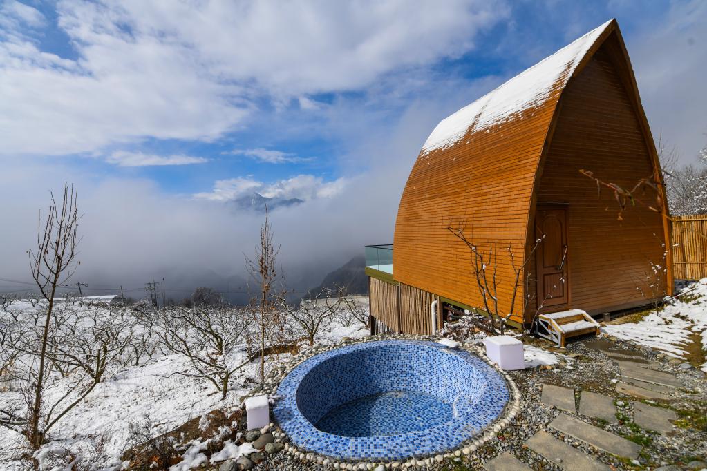 克枯村位于長江上游支流岷江邊的山腰上,是羌族聚居村寨。記者日前沿盤山公路進入村中看到,李子樹枝干上掛滿雪花,山林里6棟復式獨棟木屋民宿與遠處的雪山峽谷遙相呼應,旁邊是視野開闊的網紅餐廳,沿著旅游步道前行便看到幽蘭深邃的冰瀑群。