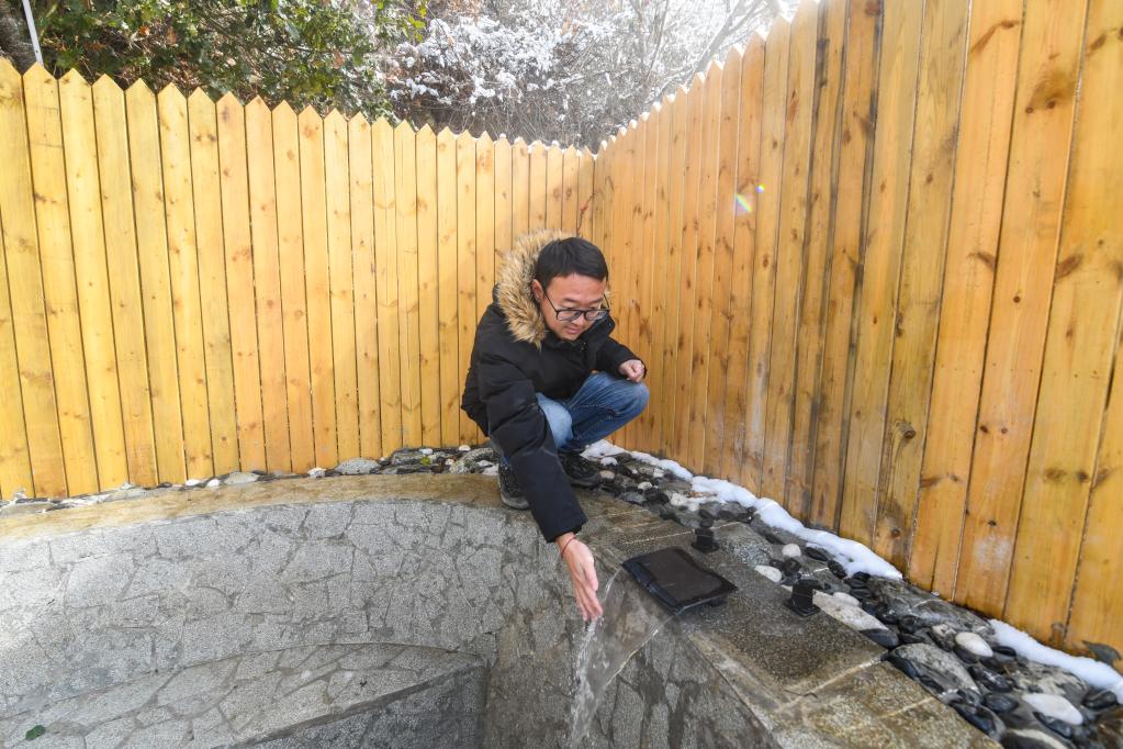 2月9日,鐘毅在小木屋內的溫泉浴池旁試水溫。新華社記者 王曦 攝