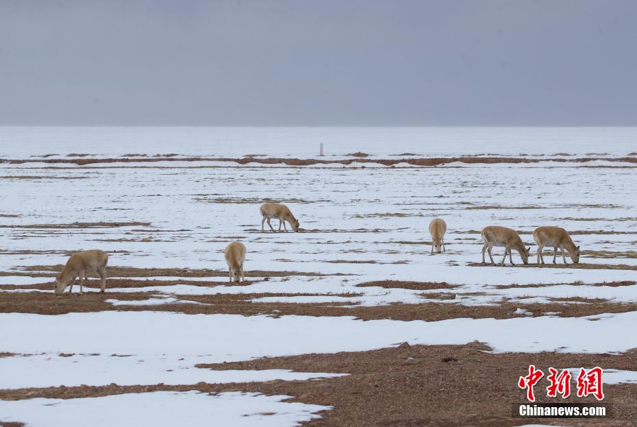 日前,可可西里地區降下春雪,在109國道五道梁附近,成群的藏羚羊在道路兩旁覓食、棲息,自由愜意。