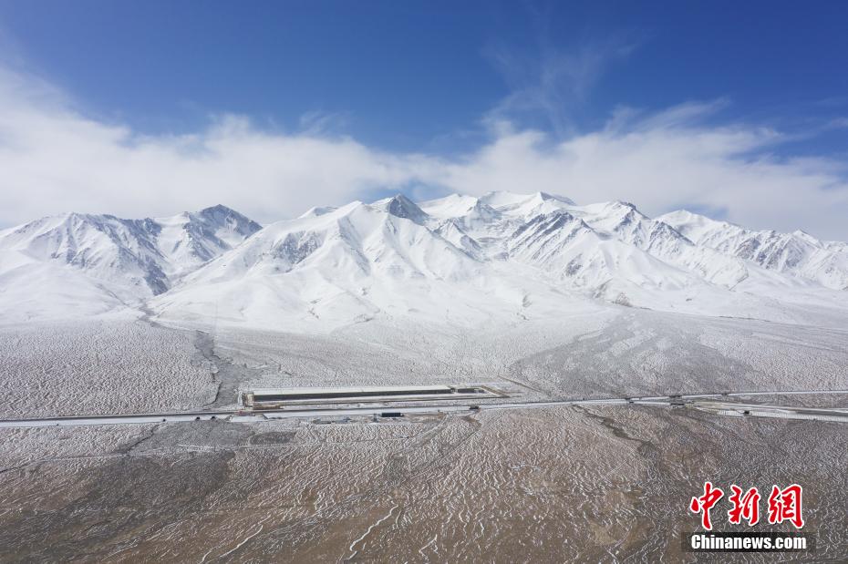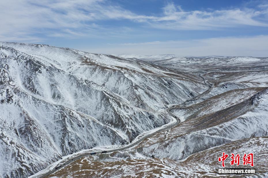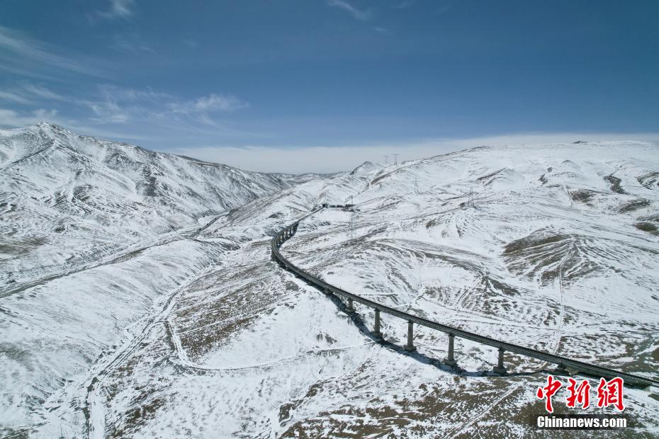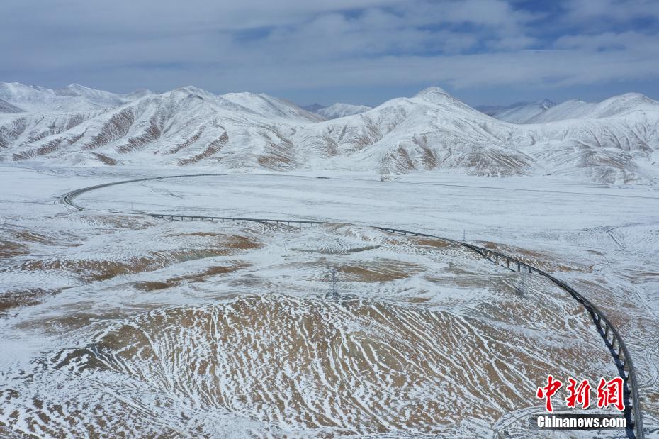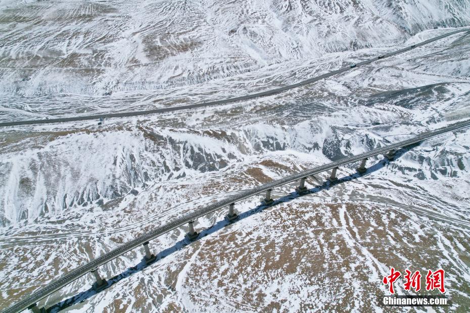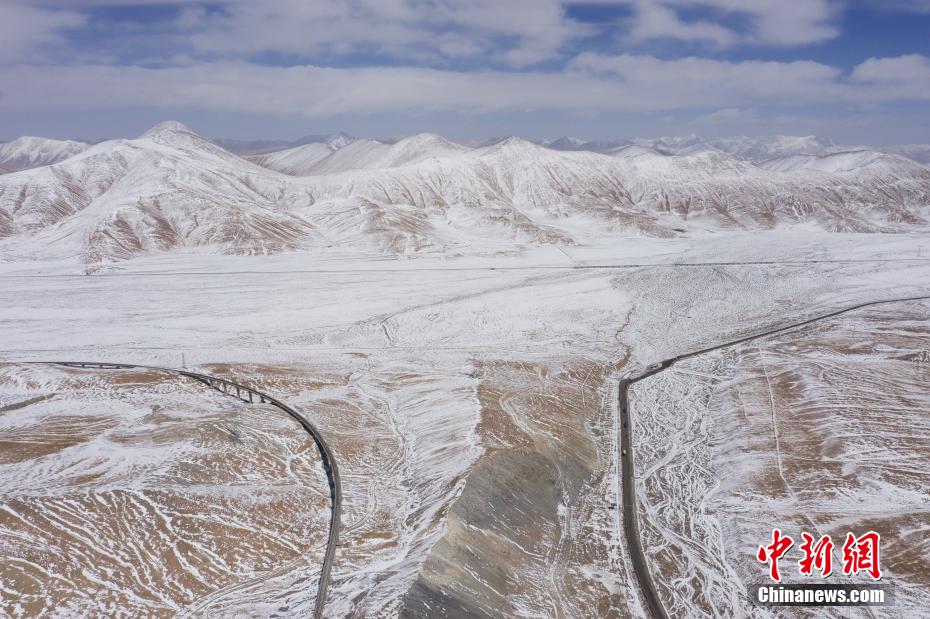 3月25日,航拍位于青海省海西蒙古族藏族自治州境內的昆侖山。一場春雪過后,青海省海西州境內的昆侖山銀裝素裹,青藏鐵路和青藏公路并行其中,雄偉壯麗。