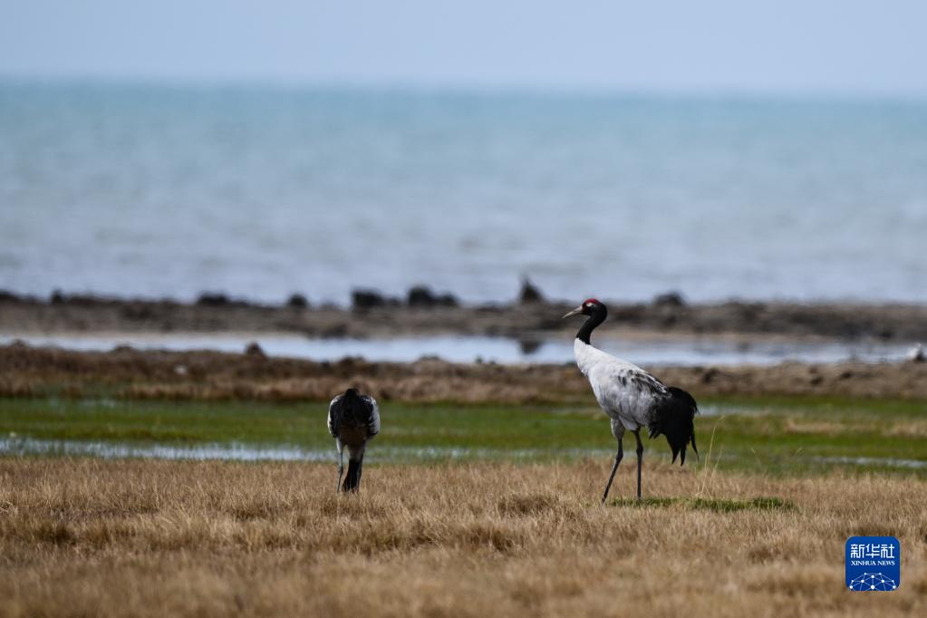 這是5月17日在青海省海北藏族自治州剛察縣境內的青海湖仙女灣景區拍攝的黑頸鶴。新華社記者 解統強 攝
