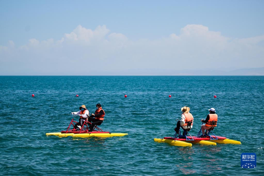 5月18日,在青海湖二郎劍景區,游客在體驗水上游樂項目。新華社記者 張龍 攝