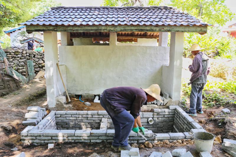 工人正在金江鎮吾竹村進行農村三格式戶廁建設