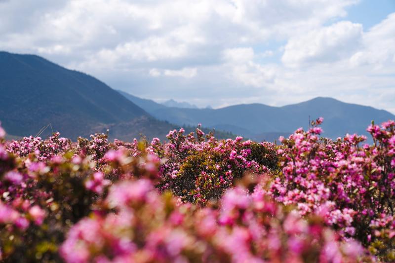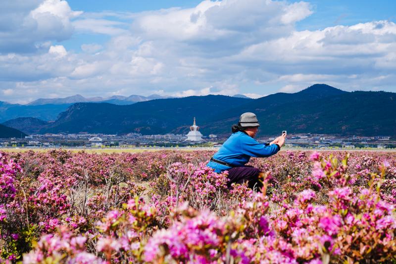 五月的香格里拉,是杜鵑花盛開的季節。建塘鎮稱尼壩子上的粉色杜鵑開放,大片的杜鵑鋪滿了山腳下的壩子,仿佛給大地鋪上了粉色地毯。
