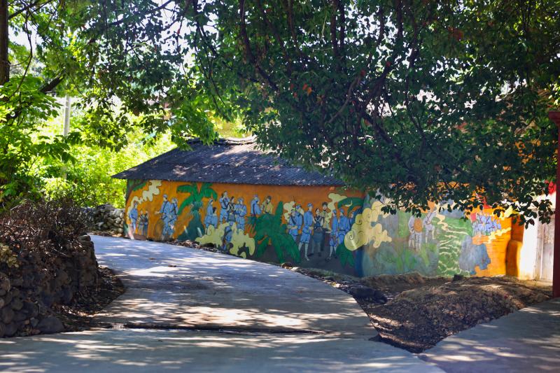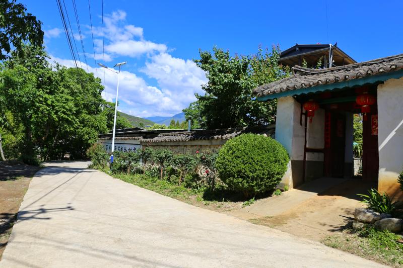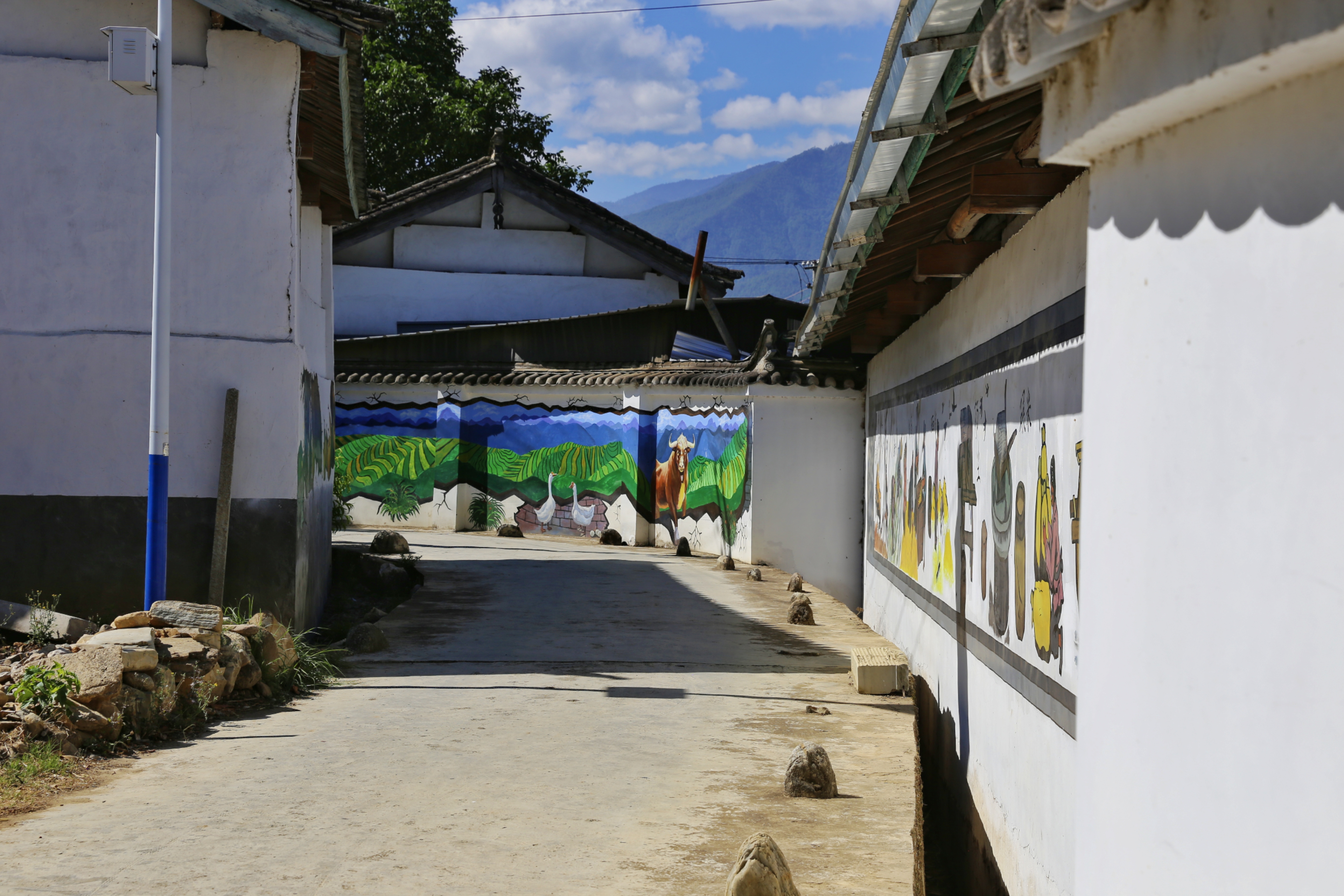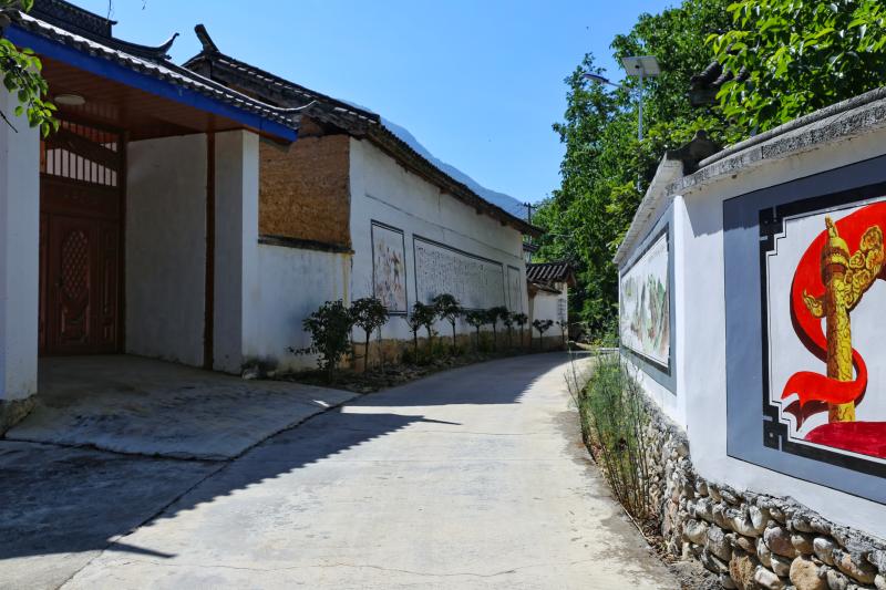 初夏時節,走進香格里拉市金江鎮吾竹村堆滿一組,映入眼簾的是遠山青黛、碧水田園,房前屋后古樹紅花相映,鄉間小道兩側果樹成蔭,一幅幅包含該村文化歷史的彩繪躍然墻上,漫步其間好不愜意。