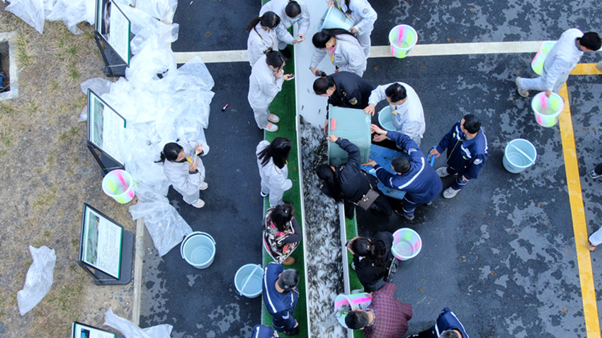 縣農牧農村和科技局工作人員與市民一起將長絲裂腹魚、短須裂腹魚、四川裂腹魚等魚苗放入雅礱江。雅江縣農牧農村和科技局/圖