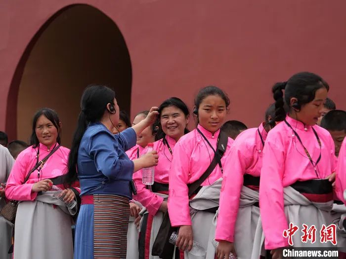 老師白瑪拉毛在給索南拉吉(中)整理頭發。中新社記者 崔楠 攝