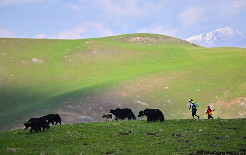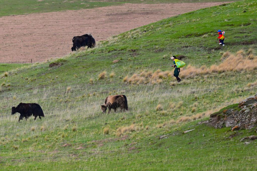 6月9日,在青海省黃南藏族自治州澤庫縣的高原草原上,當地牧民在放牧。 新華社記者 張龍 攝