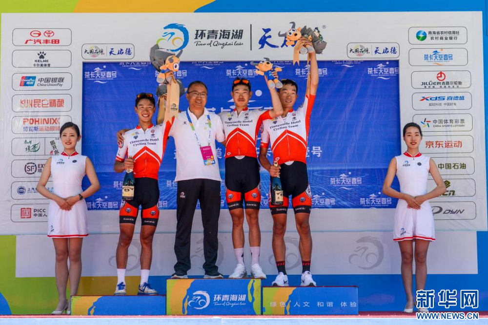 運動員手拿吉祥物站在環湖賽領獎臺。環湖賽組委會供圖。