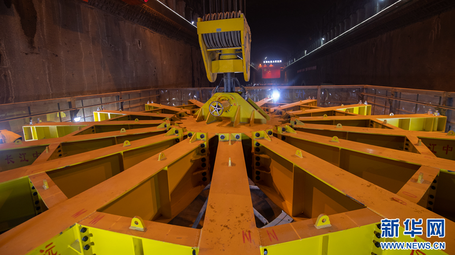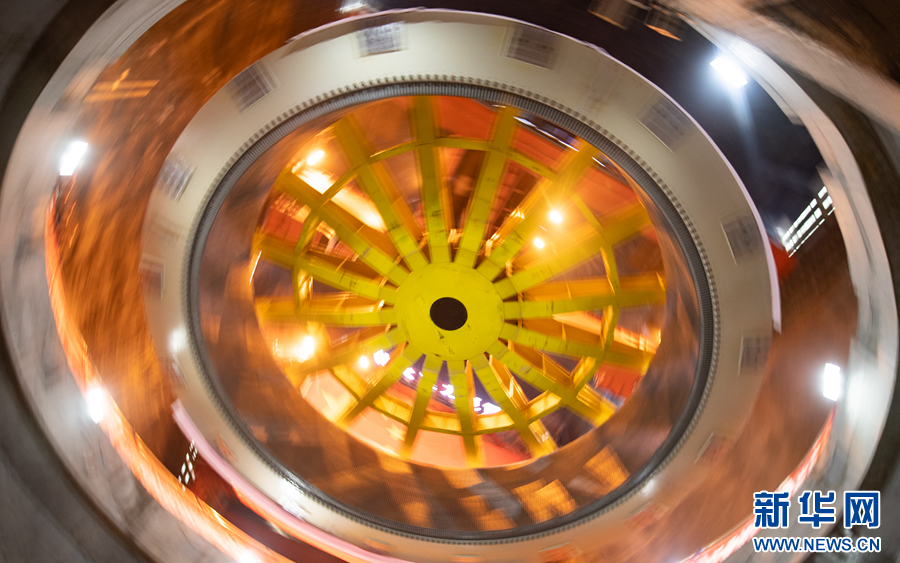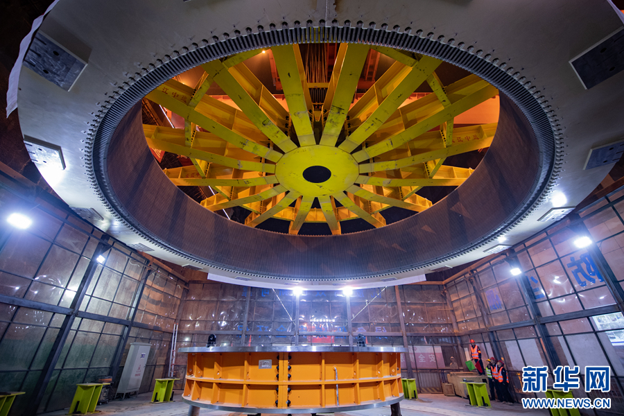 6月30日,瑪爾擋水電站地下廠房內,工作人員正在進行首臺機組定子吊裝作業。新華網 潘彬彬 攝