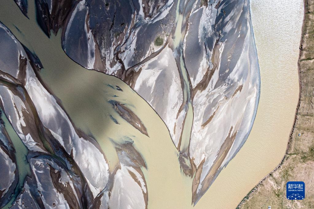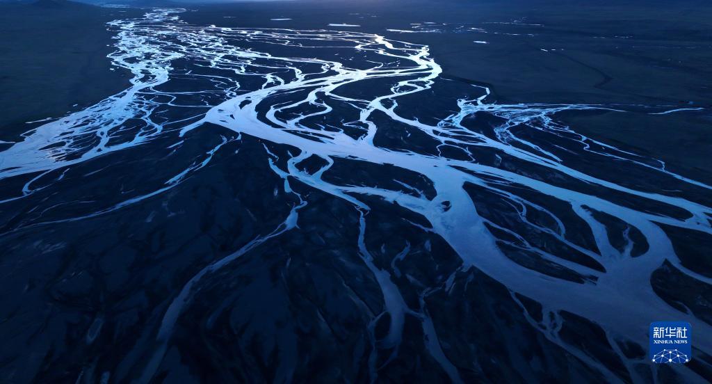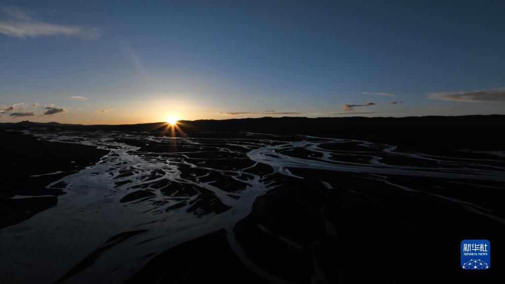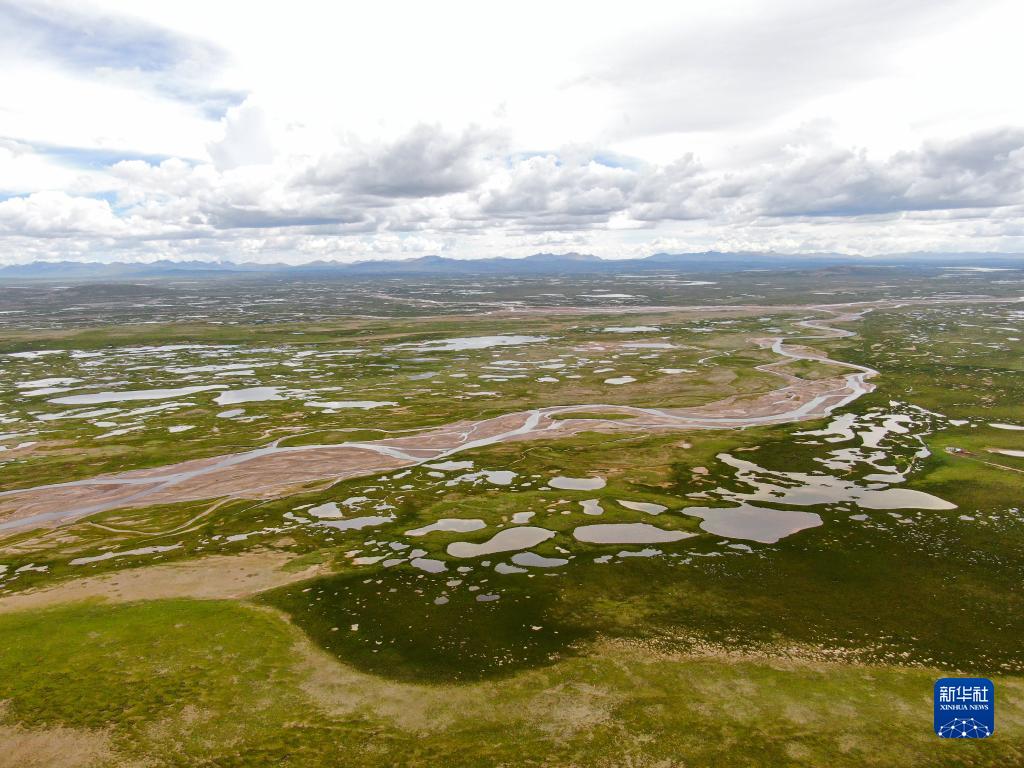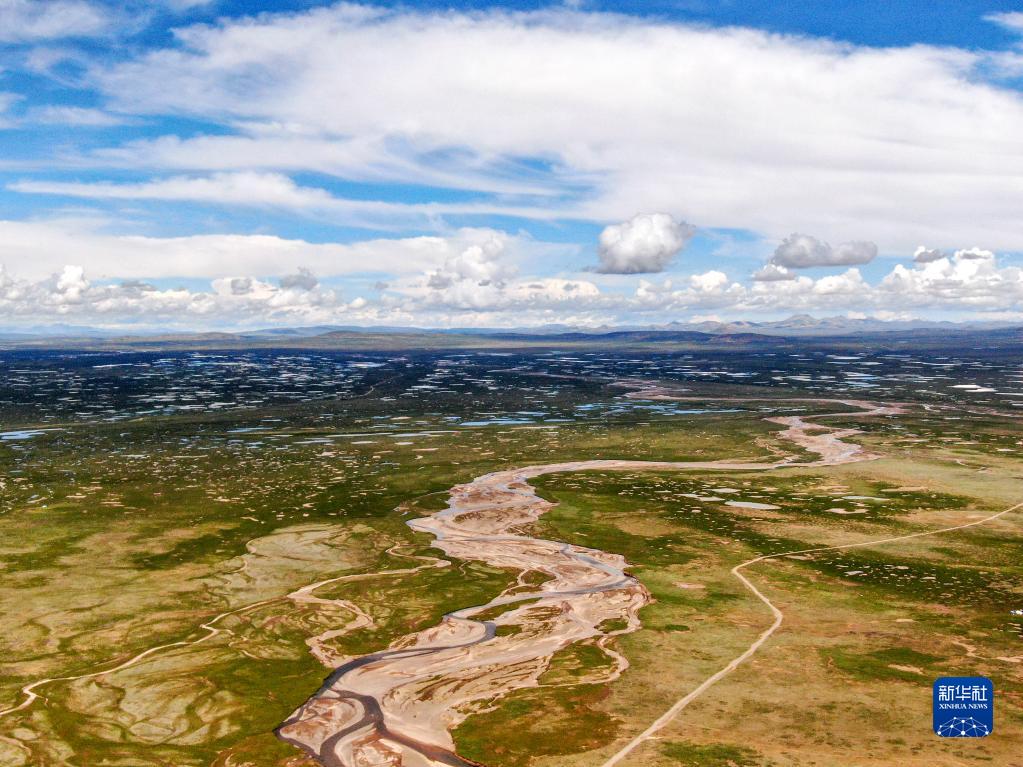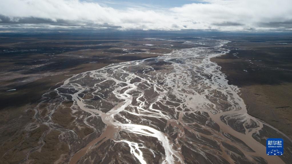 這是2022年7月27日在長江源地區拍攝的囊極巴隴河道,長江正源沱沱河和南源當曲在此匯合(無人機照片)。新華社記者 肖藝九 攝