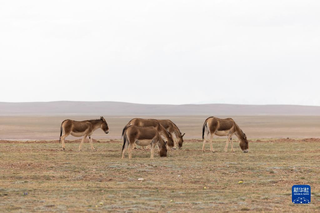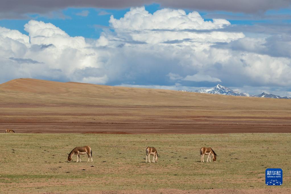 6月15日,在長江源地區的楚瑪爾河附近,幾只藏野驢在覓食。新華社記者 金立旺 攝