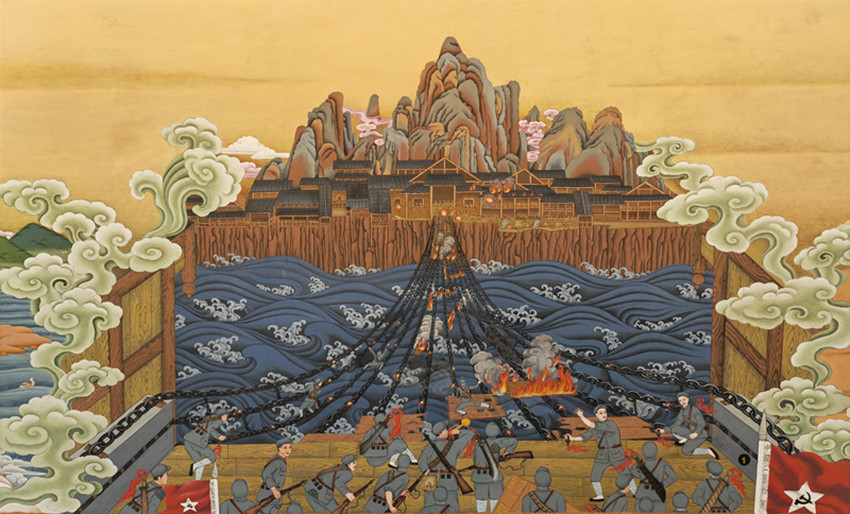 巨幅唐卡《紅星照耀雪域》中的飛奪瀘定橋場景。“紅色非遺根植中華文化故土,富含深刻的革命文化,它代表了中華文化中先進的、優秀的部分,紅軍長征更是文學藝術創作取之不盡用之不竭的源泉。[詳細]