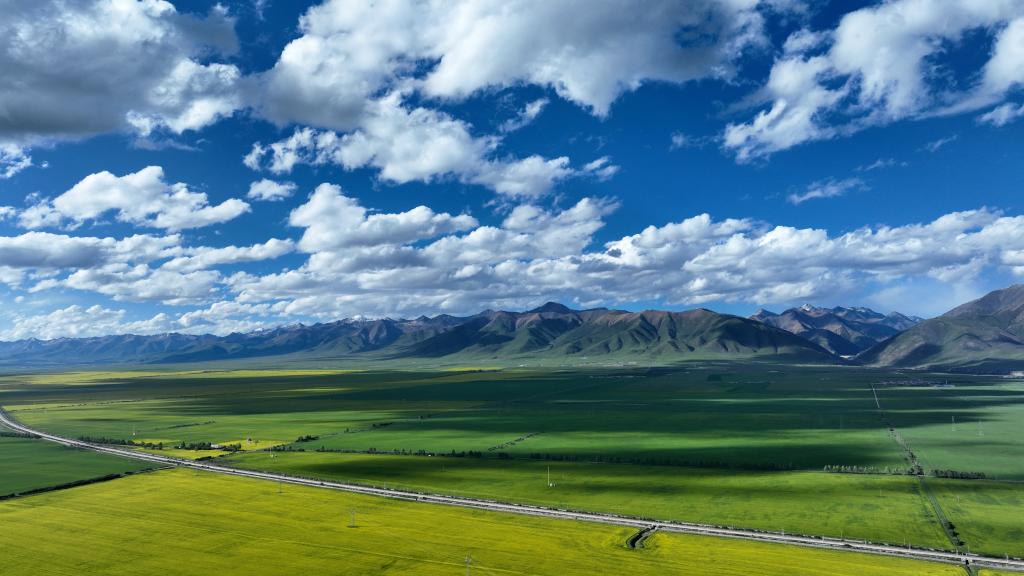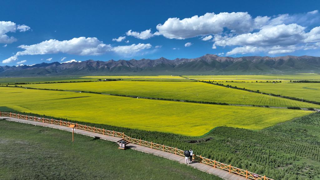 夏日,在位于祁連山腹地的青海省海北藏族自治州門源回族自治縣境內,油菜花競相綻放,花海、雪山、草原共同組成色彩斑斕的祁連山夏日畫卷。