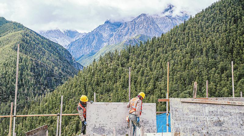 來到亞丁村中心,在一棟“黑藏房”的第三層,工人們正在施工。“你們看,旁邊這棟房子就是傳統(tǒng)樣式,是一戶一幢、二樓一底的結(jié)構(gòu),第三層中間會有一個露臺,呈‘凹’字形,但過去出租房屋的村民和民宿老板為了多建幾間客房,在第三層的露臺加蓋了房間?!蓖豕鹎钢慌缘慕ㄖf,“現(xiàn)在我們整體打造后,會還原這個露臺。”