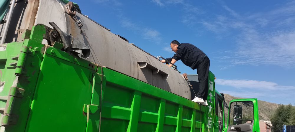 車輛進入一處服務區后,緩緩停靠在路邊。李瑾翻身跳下車去,爬上4米多高的車頂,打開水箱蓋細細查看,有幾條小魚在水面上游動著,似乎好奇地向外張望。