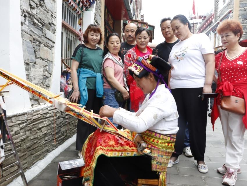 在理縣古爾溝鎮丘地村,54歲的藏族阿媽澤朗斯基端坐家門前,動作嫻熟地操作著傳統腰機,編織一款藏式花腰帶。只見她靈巧的雙手來回推拉木梭,不時變換著經線,不一會兒,五彩的絲線就化為明艷動人的吉祥紋樣,在織布上綻放開來。