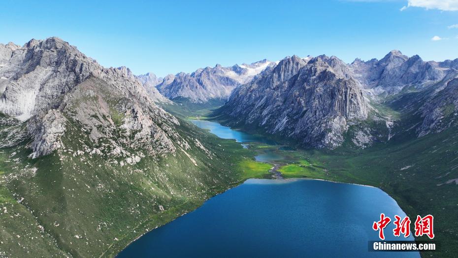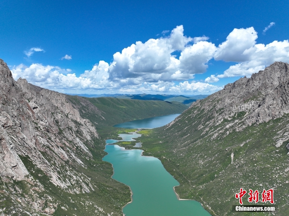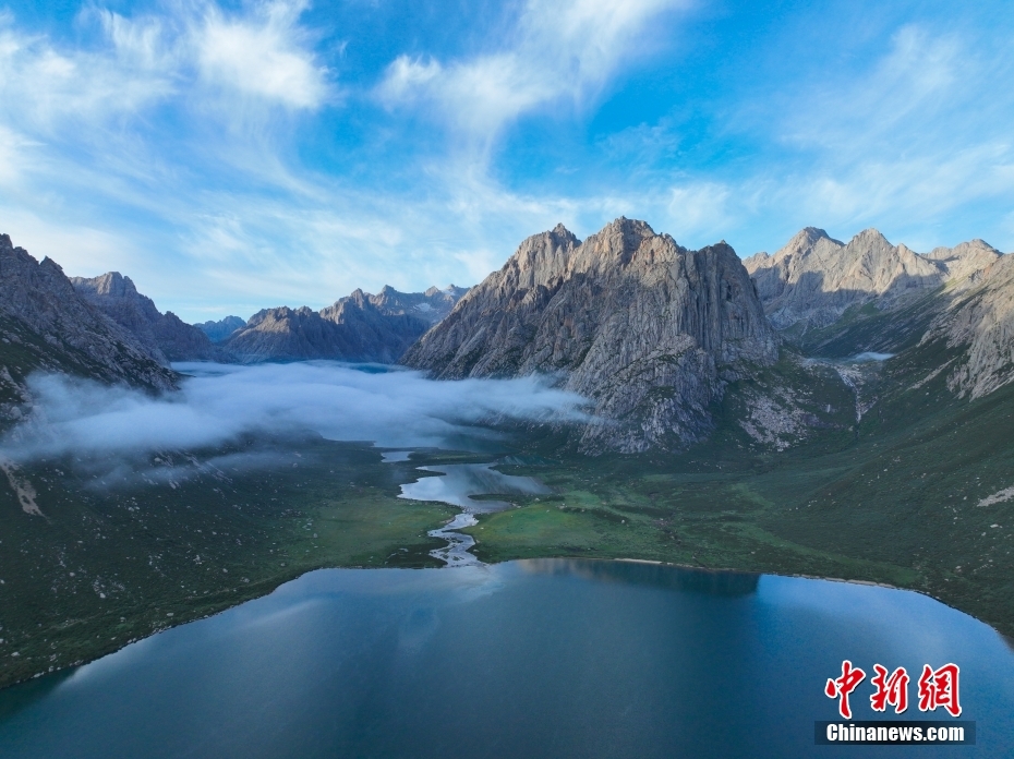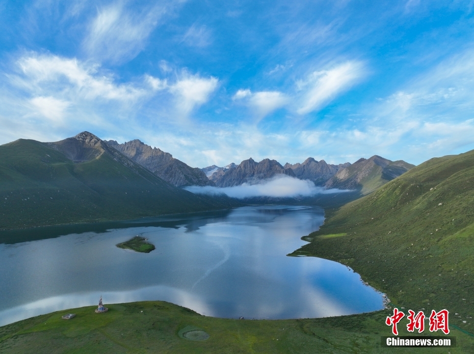 7月19日,盛夏時節,青海省果洛藏族自治州久治縣年保玉則山間云霧繚繞,山下鮮花盛開,水清草豐,靜謐的湖水與嶙峋的山巒相映成趣,宛如仙境。年保玉則總面積3469平方公里,山形如蓮花,保存有冰蝕地貌、冰磧地貌、現代冰川等地質遺跡。(無人機照片)中新社記者 馬銘言 攝