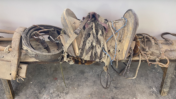 圖為五里村村史館展覽的過去運輸貨物和生活必需品上山的馬駝用具。新華網 陳穎 攝
