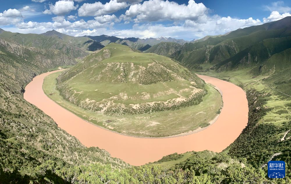 長(zhǎng)江上游,通天河在青海省玉樹藏族自治州治多縣立新鄉(xiāng)葉青村環(huán)繞山體構(gòu)成一個(gè)完美的弧度,形成了今日的網(wǎng)紅打卡地——萬里長(zhǎng)江第一灣。這里地形奇異,山水融合,有著宜人的自然風(fēng)光。