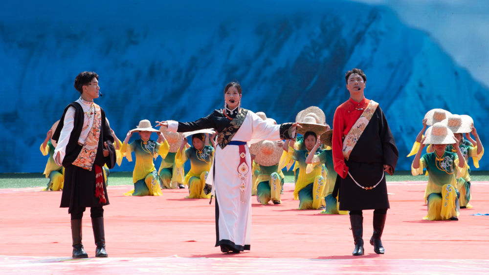 8月1日,當地群眾在海南藏族自治州成立70周年慶祝大會上表演節目。新華社 潘彬彬 攝