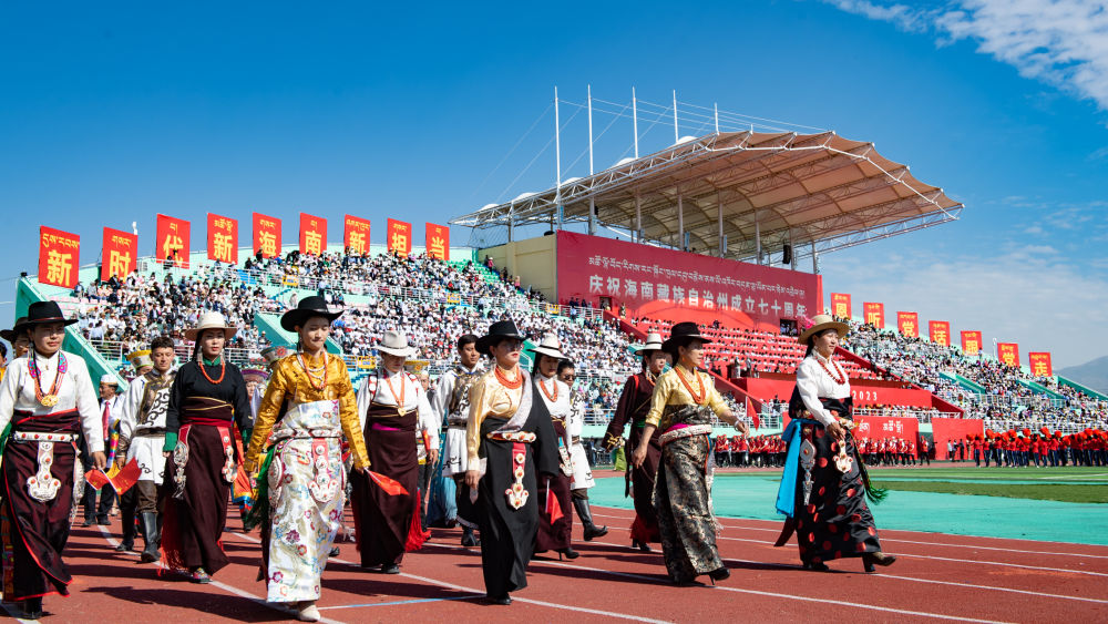 8月1日,青海省海南藏族自治州舉行慶祝成立70周年大會。海南州民族體育場彩旗飄飄,歌聲悠揚,各族群眾身著盛裝,滿懷喜悅。