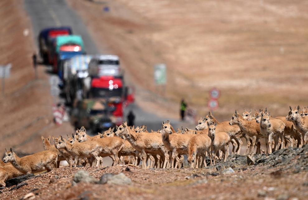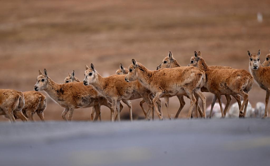 一群待產(chǎn)雌性藏羚羊正在通過(guò)青藏公路前往可可西里卓乃湖產(chǎn)仔(5月29日攝)。新華社記者 張宏祥 攝