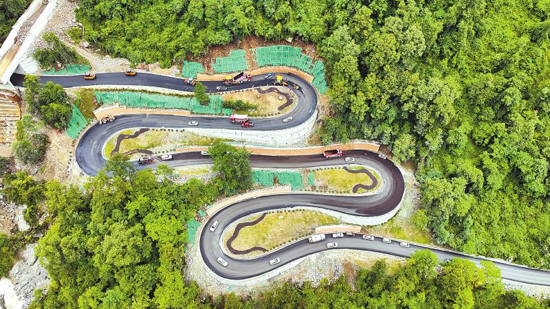 隨著道路基本修復完成,多個路段正進行瀝青路面鋪筑。俯瞰視角中,黑色的旅游公路盤山而上,逶迤山間。據介紹,海螺溝景區道路不是簡單重建,而是恢復提升,全線按三級公路標準建設,路基全部拓寬至7.5米,并鋪設瀝青混凝土路面;部分急彎陡坡段進行了改善,提升了觀景臺、護欄的安全等級,行車舒適度大為提升。