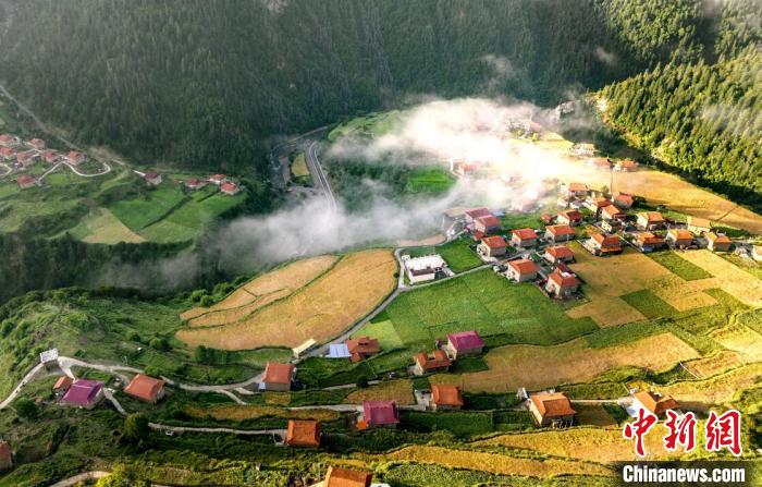 金色的青稞、鄉村及遠山相映成趣,構成一幅鄉村田園畫卷。楊正紅 攝
