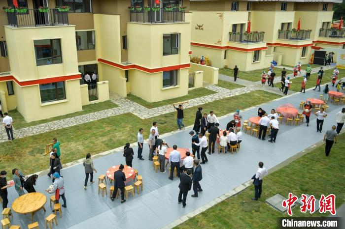 瀘定縣磨西鎮大杉樹村(幸福新村)集中安置點領取新房鑰匙后,村民們正在擺壩壩宴。中新網記者 劉忠俊 攝