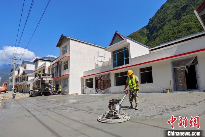 瀘定縣得妥鎮沙壩村村民統規自建房屋正在加緊屋外地面水泥鋪設。中新網記者 劉忠俊 攝