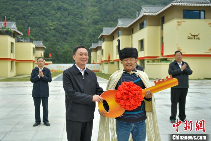 9月5日,在四川甘孜州瀘定縣磨西鎮(zhèn)大杉樹村(幸福新村)集中安置點,甘孜州委書記沈陽(左)向村民代表發(fā)放新房鑰匙。中新社記者 劉忠俊 攝
