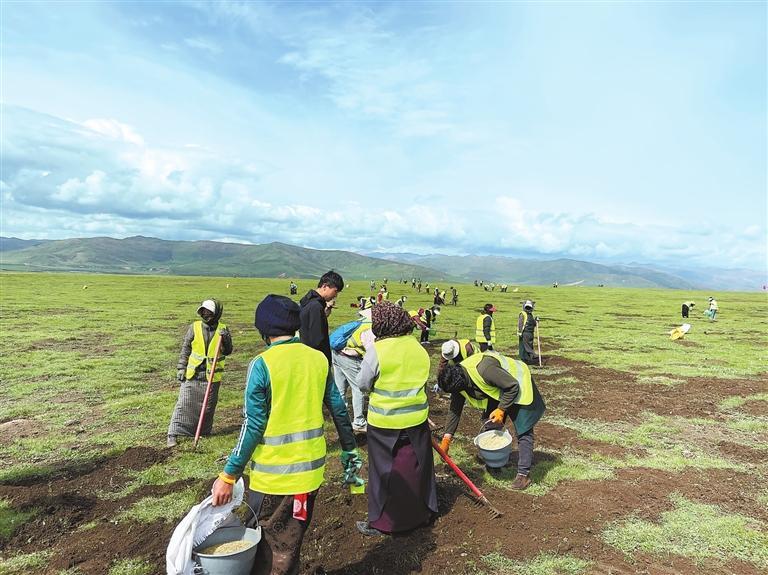 “瑪曲縣地處青藏高原,由于海拔高、氣候寒冷、植物生長期短、自然條件嚴酷等原因,可借鑒的沙化治理技術措施少,導致沙化治理難度大。”瑪曲縣草原工作站站長楊林平告訴記者,經過多年的試驗、示范和總結,瑪曲縣探索出了一套適合當地的“整地+植灌+草方格+施肥+土質改良+人工種草+圍欄”的沙丘治理技術模式,目前對已形成的沙化土地和黑土灘退化草地等進行重點治理,成效顯著。