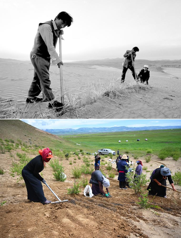 拼版照片:上圖為2002年參與防治沙漠化的工作人員在瑪曲縣黃河沿岸一處沙化草場上壓沙(新華社記者 韓傳號 攝);下圖為2023年7月6日,牧民在瑪曲縣黃河沿岸一處沙化草原治理點進行草籽補種工作(新華社記者 張可任 攝)。