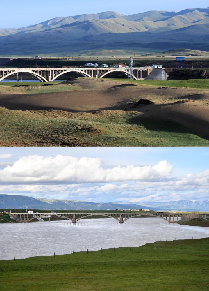 拼版照片:上圖為2011年6月10日在甘南藏族自治州瑪曲縣城郊的黃河大橋附近拍攝的大面積沙化退化草場(新華社記者 聶建江 攝);下圖為2023年7月6日在甘南藏族自治州瑪曲縣城郊的黃河大橋附近拍攝的沙化退化草場已經復綠(新華社記者 陳斌 攝)。