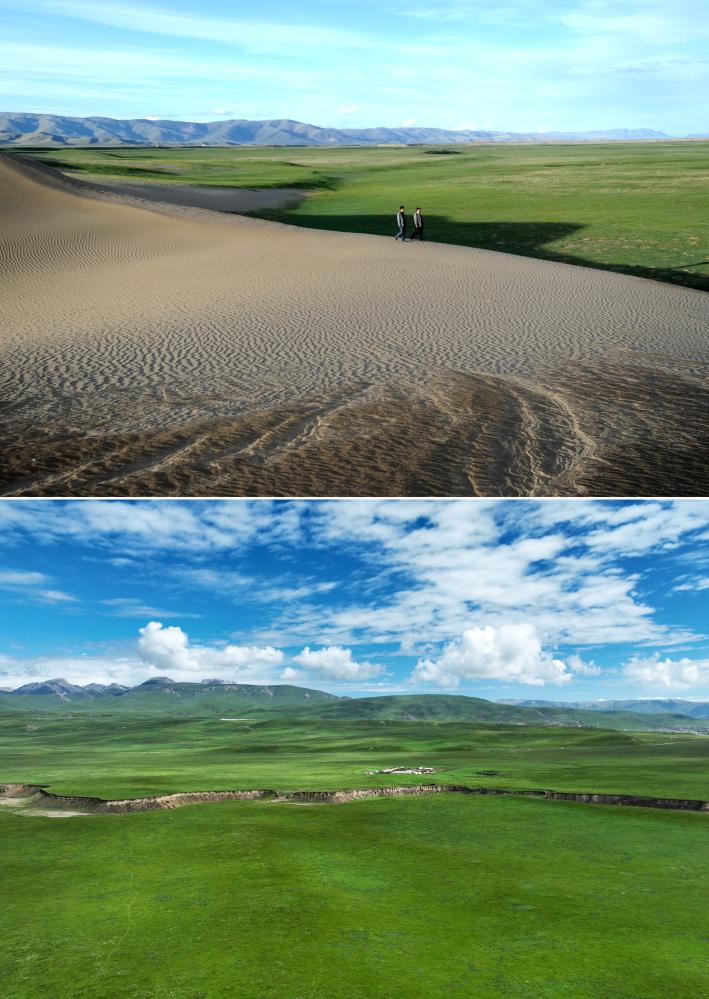 拼版照片:上圖為2011年6月9日,兩名技術人員在甘南藏族自治州瑪曲縣歐拉鄉歐強村查看草場沙化退化情況,這里已經成為當時瑪曲草原沙化最為嚴重的草場之一(新華社記者 聶建江 攝);下圖為2023年7月6日在甘南藏族自治州瑪曲縣歐拉鎮歐強村境內拍攝的經過治理修復的草原(新華社記者 陳斌 攝)。