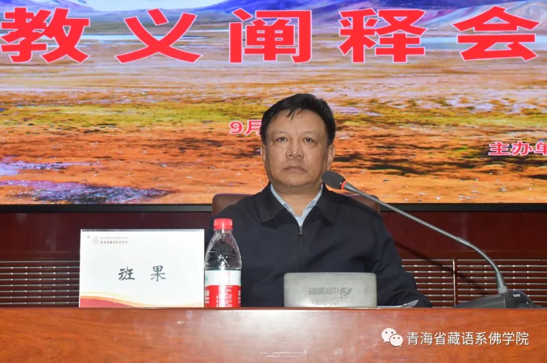 此次會議由青海省藏語系佛學院、三江源生態保護基金會、青海省藏傳佛教研究中心聯合舉辦。省委常委、省委統戰部部長班果出席并講話,第十三屆全國人大民族委員會副主任、中央民族大學教授丹珠昂奔,三江源生態保護基金會理事長鄧本太,中國藏學研究中心原副總干事洛桑靈智多杰,省政協副主席、省藏語系佛學院院長仁青安杰等領導出席。