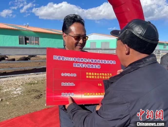 同德縣位于黃河流域上游,草場資源豐富,2022年出欄牦牛約8萬頭,出欄藏羊約24萬只。23日,當地政府與同德巴宗畜牧有限公司通過協議形式,本著互利互惠、共同發展、聯農代農的原則,為當地的合作社和牧民們發放改良的優質高原牦牛牛犢,共150頭,該批牛犢年齡均為6月—10月。