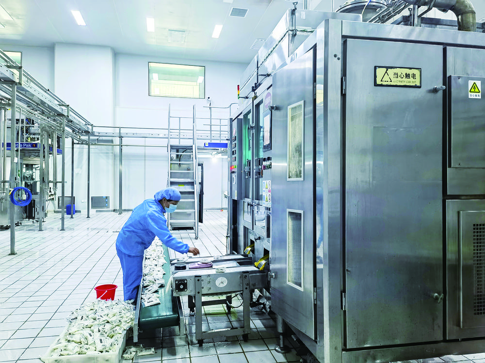 青海雪峰牦牛乳業有限責任公司工作人員對流水線產品做抽檢復稱。宋翠茹 攝
