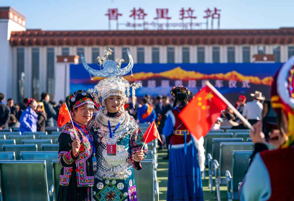 11月26日,參加麗香鐵路開通儀式的少數民族代表在開通儀式上拍照留念。新華社記者 陳欣波 攝