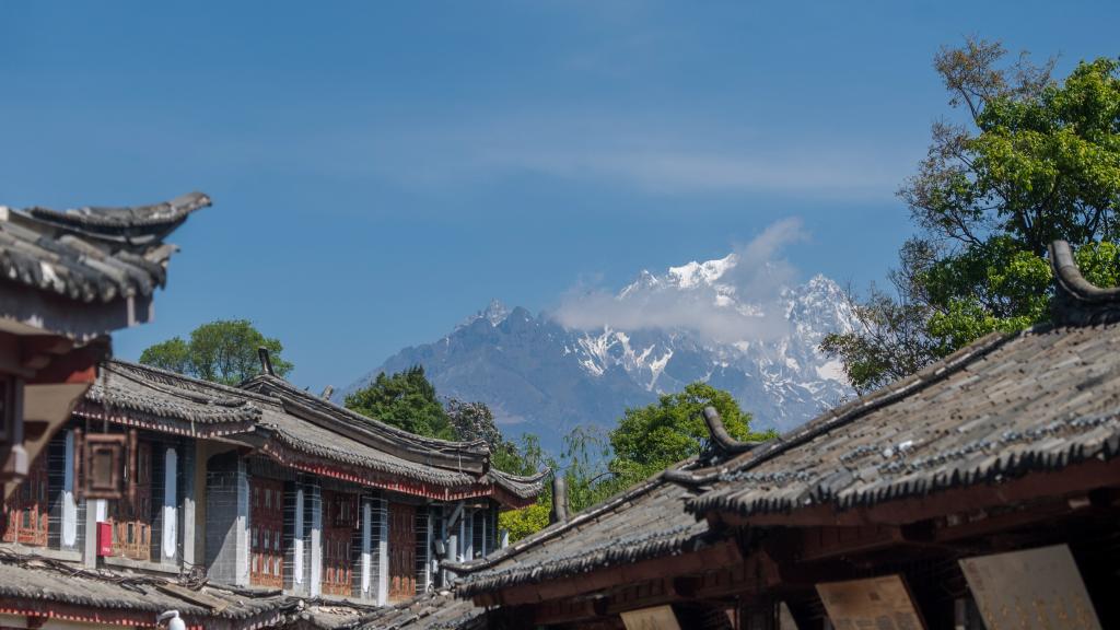 麗江古城的飛檐翹角和玉龍雪山相互掩映(資料照片)。新華社記者 胡超 攝