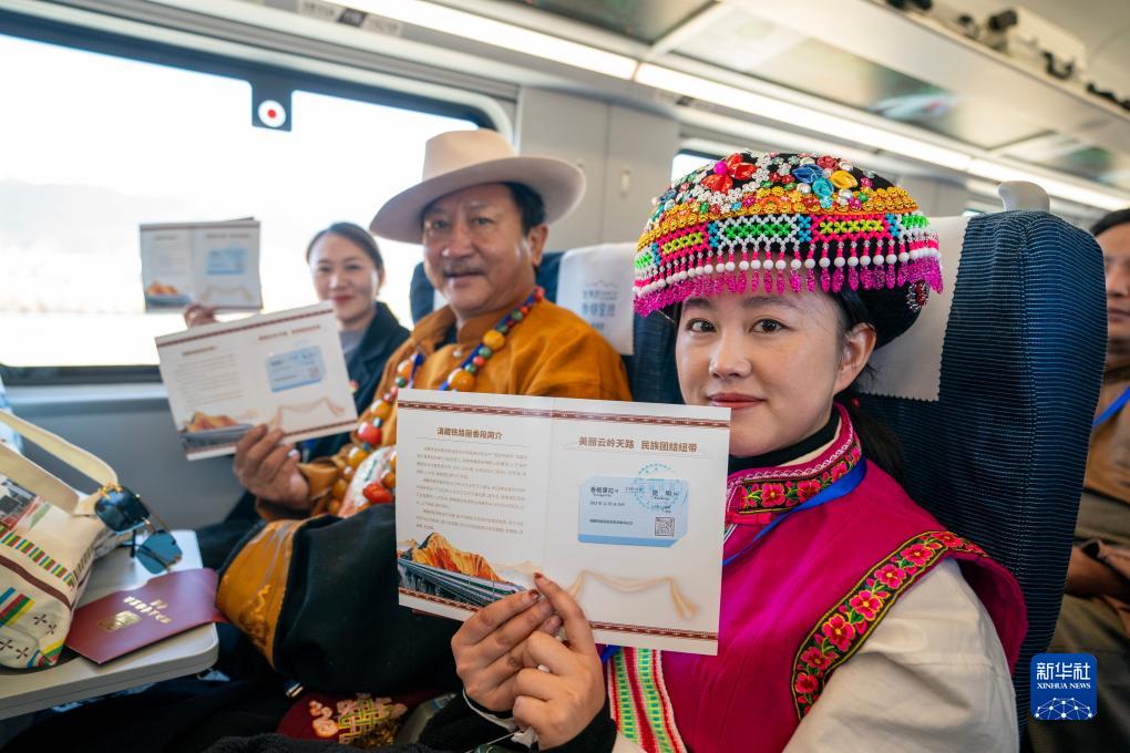 11月26日,乘坐麗香鐵路開通首發列車的嘉賓在車廂內展示紀念車票。新華社記者 陳欣波 攝