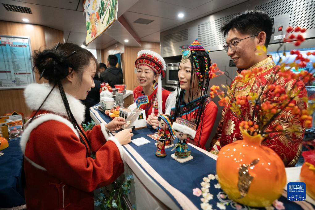 11月26日,乘坐麗香鐵路首發列車的乘客(左)向列車乘務員咨詢紀念品。新華社記者 陳欣波 攝
