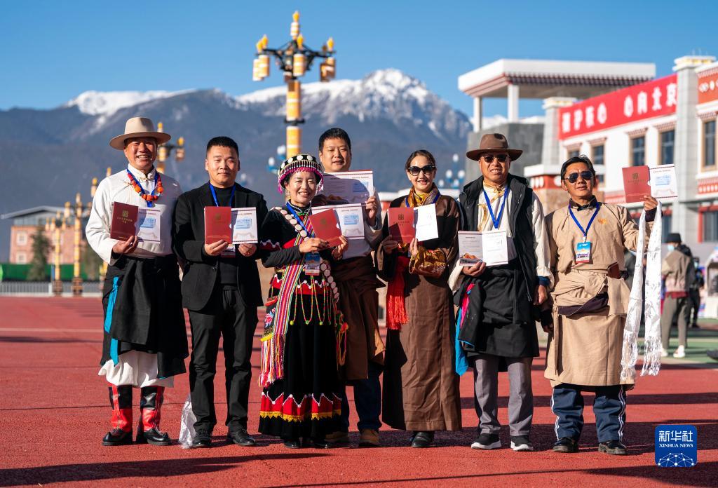 11月26日,參加麗香鐵路開通儀式的少數民族代表在開通儀式上拍照留念。新華社記者 陳欣波 攝