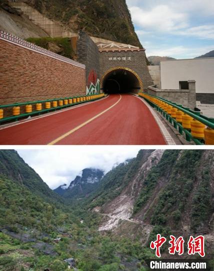 上圖為海螺溝景區重建的杜鵑林隧道建成后。下圖為建成前的隧道附近受損道路情況。(拼圖)蜀道集團供圖