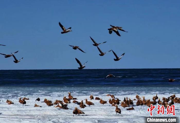赤麻鴨“定居”青海湖 成為青海湖越冬水鳥絕對優勢種