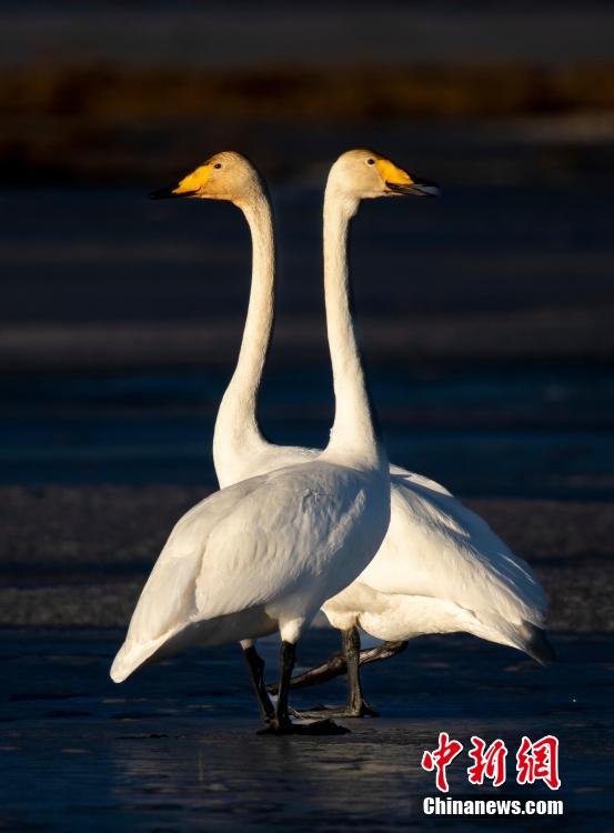 多只天鵝在湖冰上嬉戲。青海可魯克湖-托素湖省級自然保護區 供圖